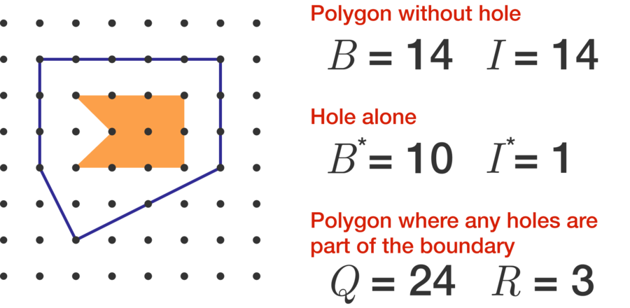 将我们刚刚获得的公式与 Pick 定理的原始版本进行比较,我们发现它们几乎相同。唯一的区别是现在我们 添加了孔的数量。